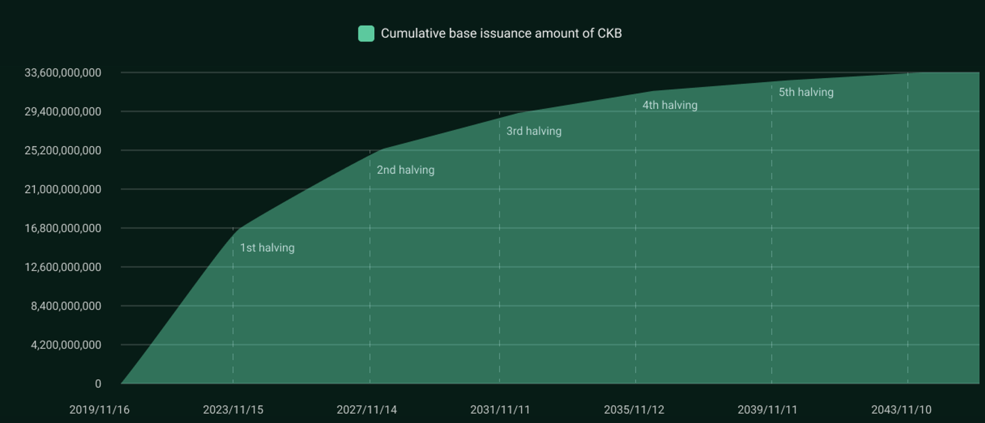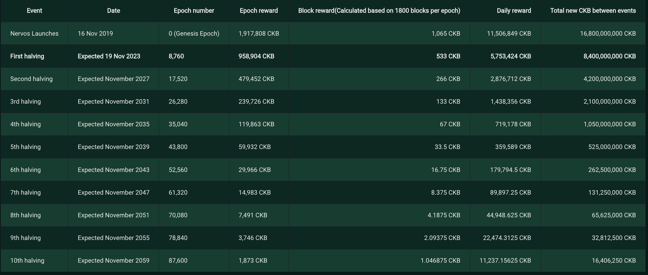 В первичном выпуске механизм CKB напоминает вознаграждение за блок Биткойна. В течение примерно 84 лет 33,6 миллиарда CKB будут выпущены в качестве вознаграждения за майнинг. Каждая эпоха (около 4 часов) производит 1 917 808 CKB. Каждые 8 760 эпох (примерно каждые четыре года) награды уменьшаются вдвое до тех пор, пока выдача не будет завершена. CKB пережил свой первый халвинг в ноябре прошлого года.