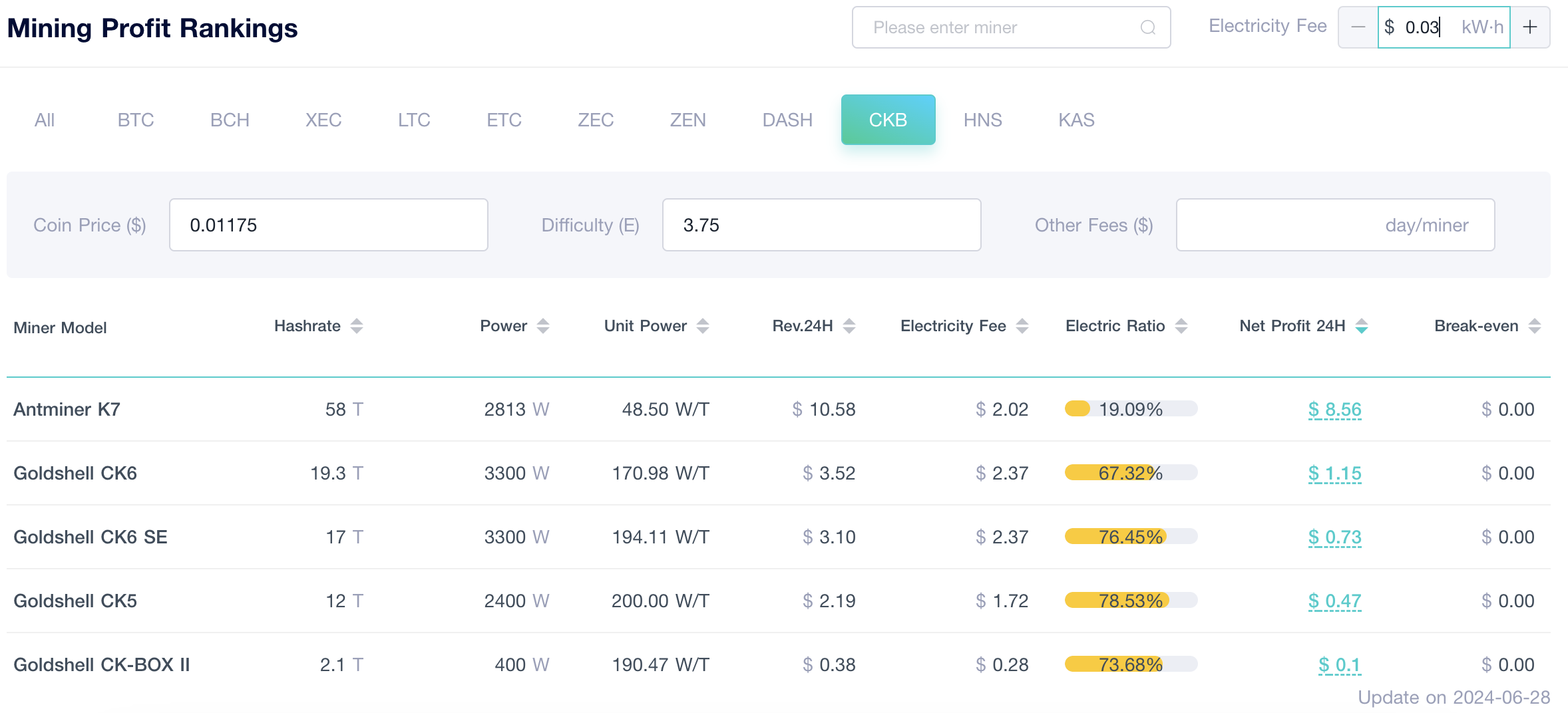 По мере того, как CKB быстро развивалась, майнинг оборудование также быстро развивались. К 2020 году майнинг CKB вышел на стадию ASIC-устройств. Майнеры могут обратиться к рейтингу доходов майнеров ViaBTC, чтобы найти наиболее подходящее оборудование для майнинга CKB. Однако при текущей цене на электроэнергию в $0,03/кВт⋅ч только Antminer K7 показывает идеальную рентабельность; Другое майнинг оборудование могжет не покрывать расходы на электроэнергию, если цена превышает этот стандарт.
