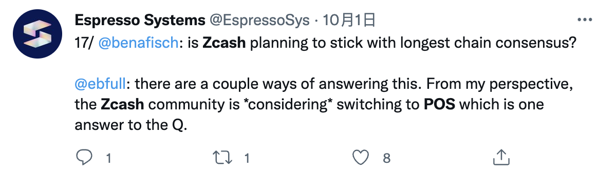 Zcash 项目的创始人 Zooko Wilcox 其实早前对以太坊合并转向PoS并不看好,认为它根本就不会实现。但在与 Buterin 一同出席的 Mainnet 2022会议上,Zooko却毫不吝啬地对以太坊开发团队大为赞赏,并发出“如今合并的成功证明了此前我的看法是错误的”结论。作为隐私币的代表项目,Zcash 与BTC、LTC等老牌的加密货币一样,需要依赖矿工通过竞争获得网络区块奖励,并在块上添加交易,以此维护该网络的正常运作。但 Zcash 官方团队也看到了转向PoS权益证明将会带来的多重好处,其开发组织 Electric Coin Company(ECC)发布的三年路线图中,计划了在2025年内将 Zcash 从PoW共识机制转变为更环保的PoS机制。