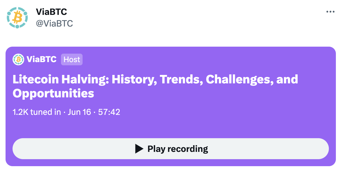 2023年正是老牌加密项目莱特币的减半年,自2011年11月上线的它,至今已稳定运行了12年,当前流通市值超58.7亿美元,在加密货币市值榜单上排名第11位。随着减半时间(预计8月3日前后)的临近,无论是矿工群体还是交易者,他们对莱特币的兴趣越发强烈。为了让更多加密爱好者了解莱特币,ViaBTC于2023年6月16日在官方推特举办了一场线上研讨会,并于会议当日邀请到行业各方面专业人士,包括 Litecoin Foundation的Keith Yong、Hiveon的Dmitry Gomon和Arthur、莱特币OG的Shan Belew和ViaBTC的代表Paphy Cai等,就“Litecoin 减半:历史、趋势、挑战和机遇”这一主题展开了探讨。