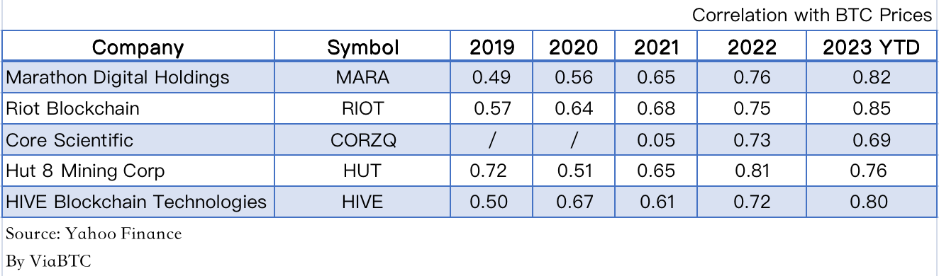 选取5家加密矿业公司,他们分别是Marathon Digital、Riot Blockchain、Core Scientific、Hut 8和HIVE Blockchain Technologies。分析自2019年到2023年的股票价格与比特币价格的表现,借助相关性系数公式,得出结果如下: