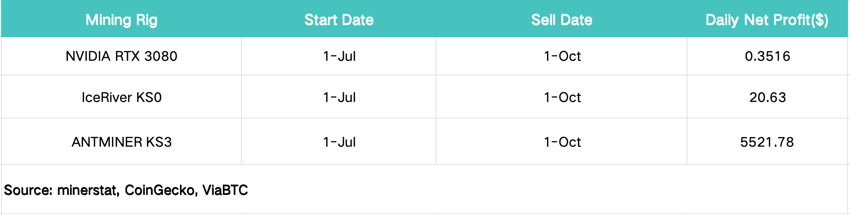 如果连续挖完3个月,并在10月1日以$0.046价格卖出的话,单季度收益为(120088.68×0.046-2.3)×92=$508003.7,平均日收益为5521.78美元。