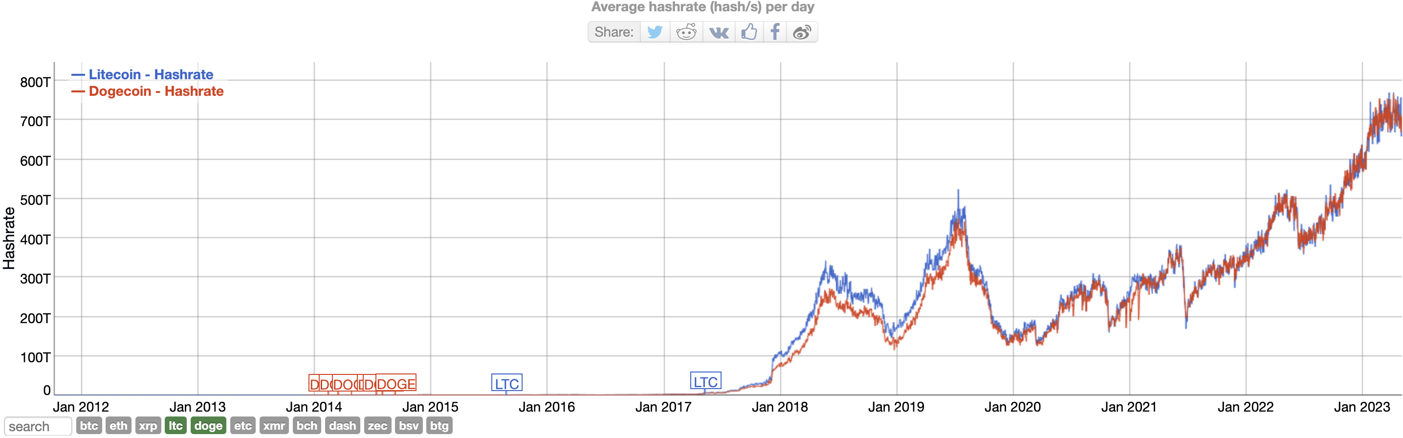 9年前萊特幣創始人Charlie Lee一個“將狗狗幣和萊特幣進行聯合挖礦”的提議,挽救了當時共識不大、價值極低且隨時可能遭受駭客攻擊的狗狗幣。當時開發者決定引入輔助工作量驗證機制(AuxPoW),現在看來無異於是當年狗狗幣網路做出的最明智決定之一。借助萊特幣的“名氣”以及通過AuxPoW技術從萊特幣網路獲得的哈希算力,狗狗幣網路安全性得到了保障,時至今日已經發展成市值前10的頭部加密貨幣。
