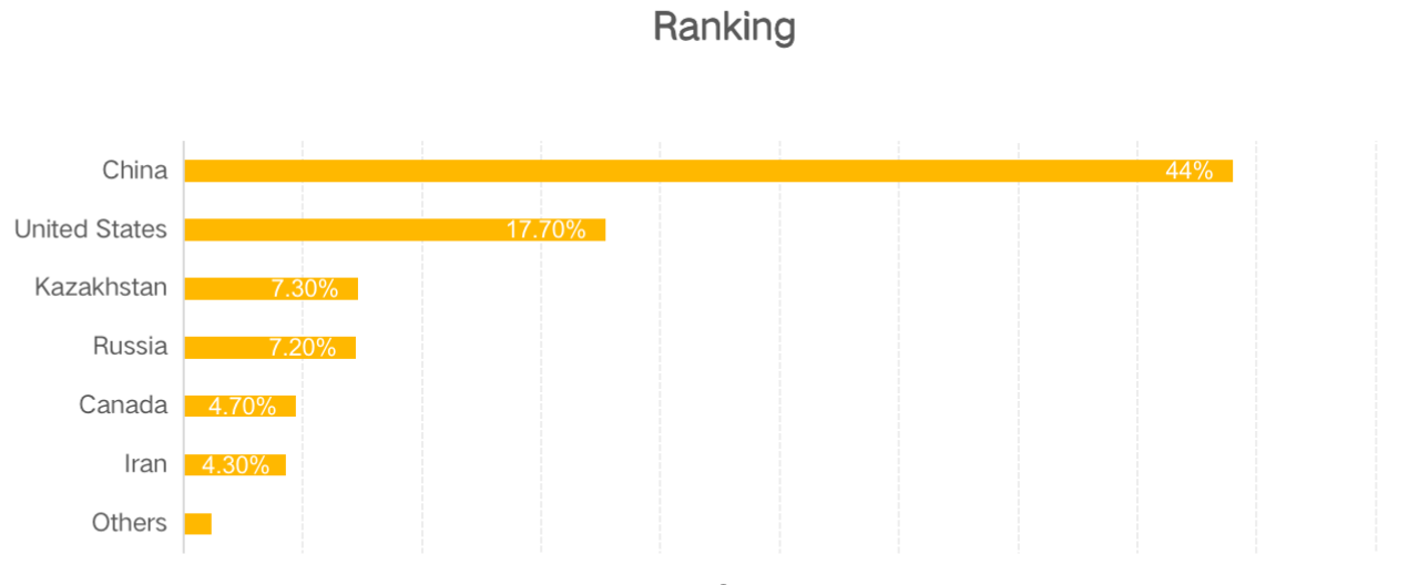 根據CCAF(Cambridge Centre for Alternative Finance)機構5月21日的數據顯示,當前比特幣的挖礦活動主要還集中在中國,其所占算力近全球算力的一半,占44%左右;第二名美國占17.7 %;第三名哈薩克斯坦占7.3%;第四名俄羅斯占7.2%;第五名加拿大占4.7%;第六名伊朗占4.3%;第七名馬來西亞占3.2%,其他國家占全網算力均不超過1%。