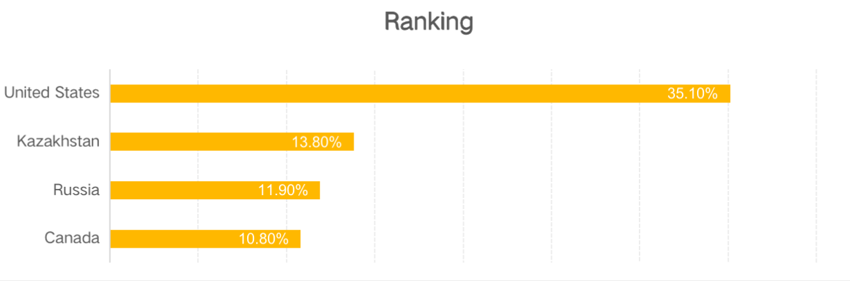 但在“礦場清退潮”兩個月後,7月21日的數據顯示,中國地區的算力驟減至0,美國則取而代之成為全球比特幣挖礦中心,占全網算力35.1%;哈薩克斯坦占13.8%,位居第二;俄羅斯占11.9%位居第三;加拿大10.8%居於第四。